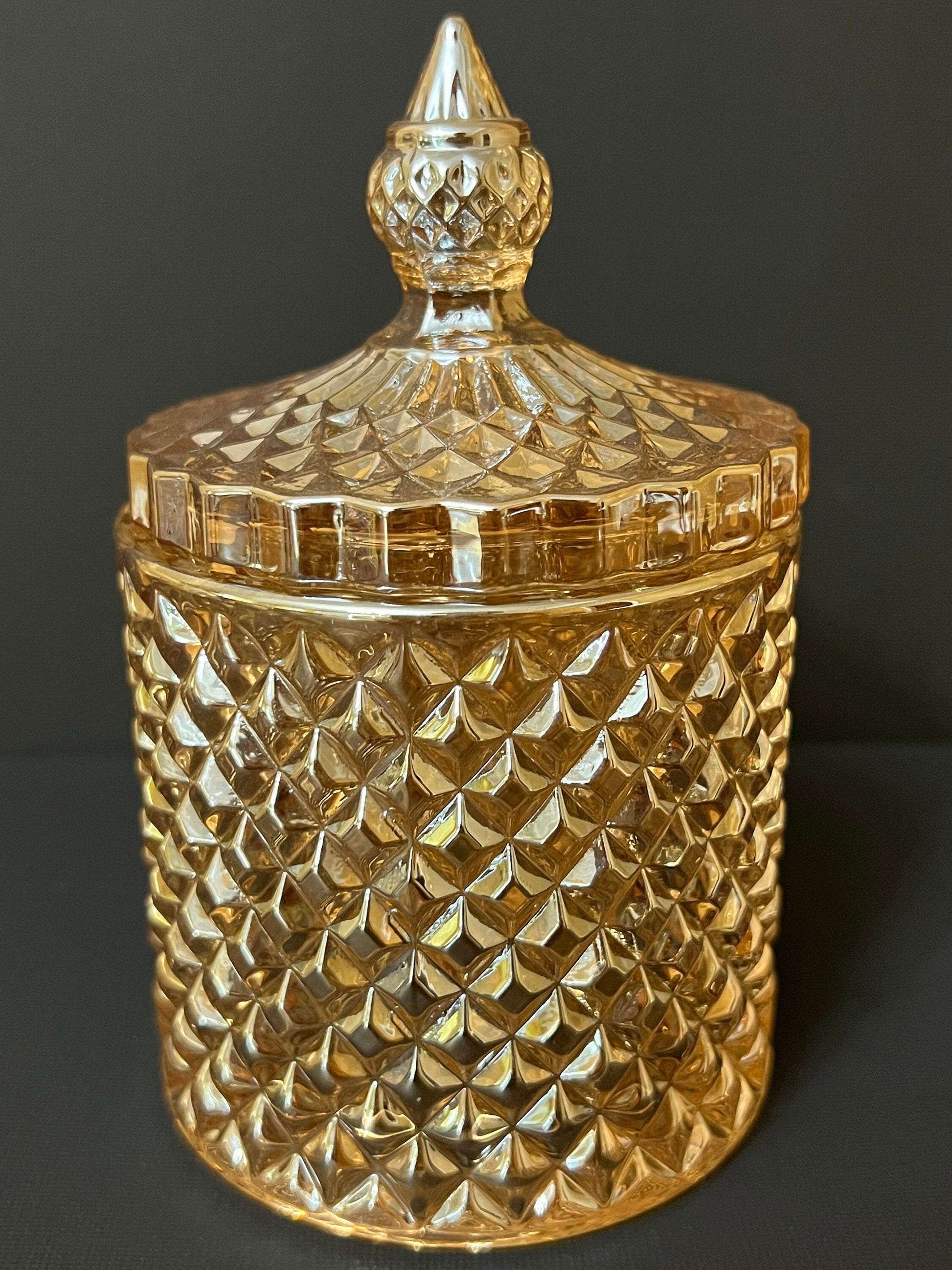 A striking triangular pattern made to catch the eye, the Geometric Jar is sure to impress in any situation. The unique pattern upon the jar’s surface adds depth and an interesting effect when lit, making it perfect for anything from luxury candle making to homemade candles with a touch of class. The Geometric Collection is the answer for any candle maker from a hobbyist to the business owner, the jars are available in Iridescent , amber, and multi-colored patterns. ( Note, The Jar is 10oz, the height is 14 cm, and the diameter is 8.5 cm ! )